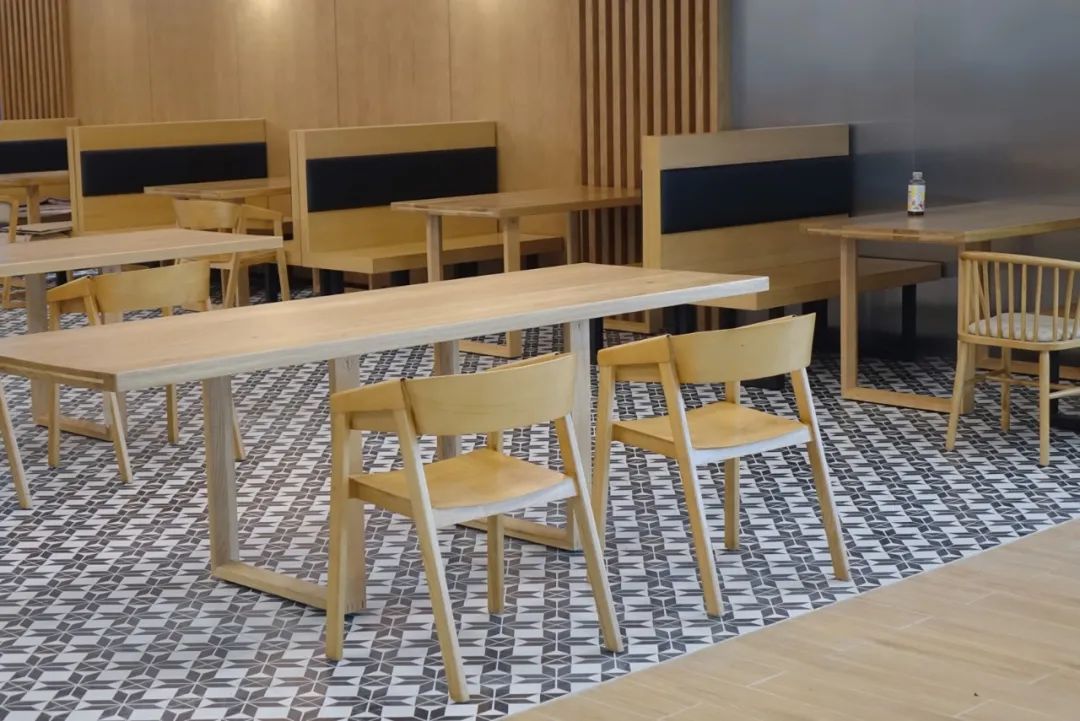 家具是檢驗(yàn)用餐舒適感的關(guān)鍵,也是促進(jìn)用餐人群關(guān)系的媒介。餐廳的活動(dòng)家具材料采用進(jìn)口實(shí)木加不銹鋼結(jié)構(gòu)支架,環(huán)保、耐用、時(shí)尚。開放用餐區(qū)的餐桌選型是功能性的高度體現(xiàn),主要解決用餐人數(shù)日劇增加的運(yùn)營需求和追求因地制宜地設(shè)計(jì),以四人桌、六人桌位為主,搭配依建筑柱而設(shè)計(jì)的高餐臺,高效容納用餐人數(shù);以少數(shù)卡座、二人桌為輔,提供更多用餐環(huán)境需求的選擇。各區(qū)域通過活動(dòng)隔斷、地磚花色巧妙進(jìn)行空間劃分,減少施工成本的同時(shí)增強(qiáng)空間美感。餐桌采用天然手工原木拼接的圓桌,餐椅均設(shè)有圓潤的靠背、扶手,軟滑的超纖皮坐墊,打造舒適體驗(yàn)的同時(shí),賦予空間的更多的層次性。
