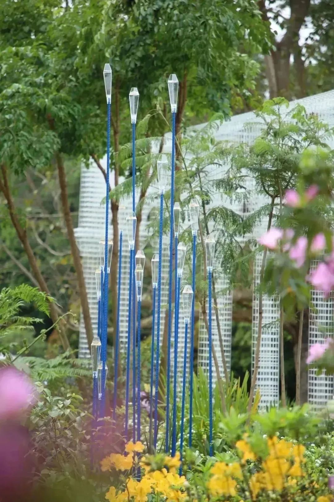漫步在蜿蜒的小徑上,高山杜鵑、花灌木、粘葉豆等各色花卉、喬灌木植物錯落分布著,香氣宜人。起風(fēng)時,湖藍色的豎向立柱在水池中央隨風(fēng)搖擺,營造“長風(fēng)破浪會有時,直掛云帆濟滄?!钡姆諊饩常⒁饣洶暮献鞒孙L(fēng)遠航,精彩紛呈。