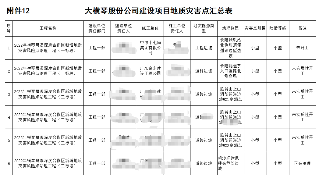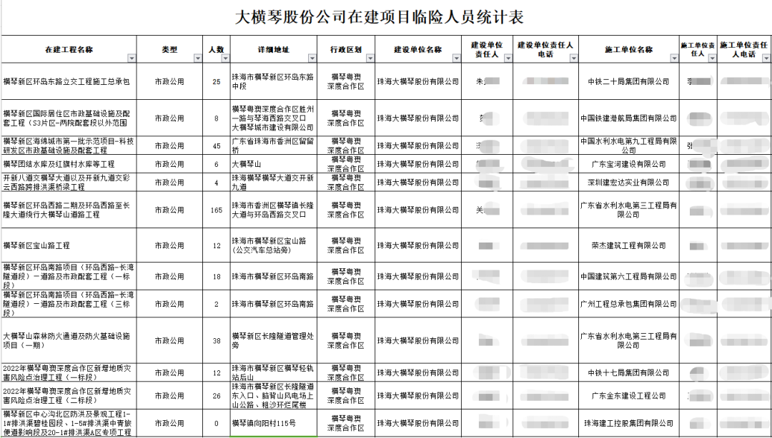 股份公司目前負責建設和運營項目共25個,涉及市政公用、道路、隧道、橋梁、水上等多個領域,涉及臨險轉移人員共2885人。公司已提前布局,對公司管理責任范圍內(nèi)的地質災害點、排洪渠、建設工地等隱患點,進行系統(tǒng)排查。據(jù)統(tǒng)計,今年公司責任區(qū)域內(nèi)隱患點共16處,橫琴7處、富山9處,主要包括2022年橫琴粵澳深度合作區(qū)新增地質災害風險點治理工程(一標段),富山工業(yè)園二圍北片區(qū)二圍北市政配套項目、高標準廠房一期項目、富山工業(yè)城二圍北片區(qū)廠房一標段項目等。