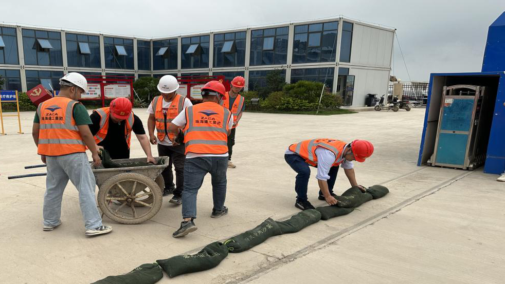 當天下午15時,雨勢逐漸加大,氣象局將臺風預警信號升級為橙色。面對險情,項目部啟動了防臺風橙色應急預案,各小組按預案分工,立即展開應急響應工作,對現(xiàn)場及危險區(qū)域進行警戒;所有人員安全撤離至安置點;重要物資及資料開始轉移;對基坑周邊低洼地帶,堆砌沙袋,防止雨水倒灌......