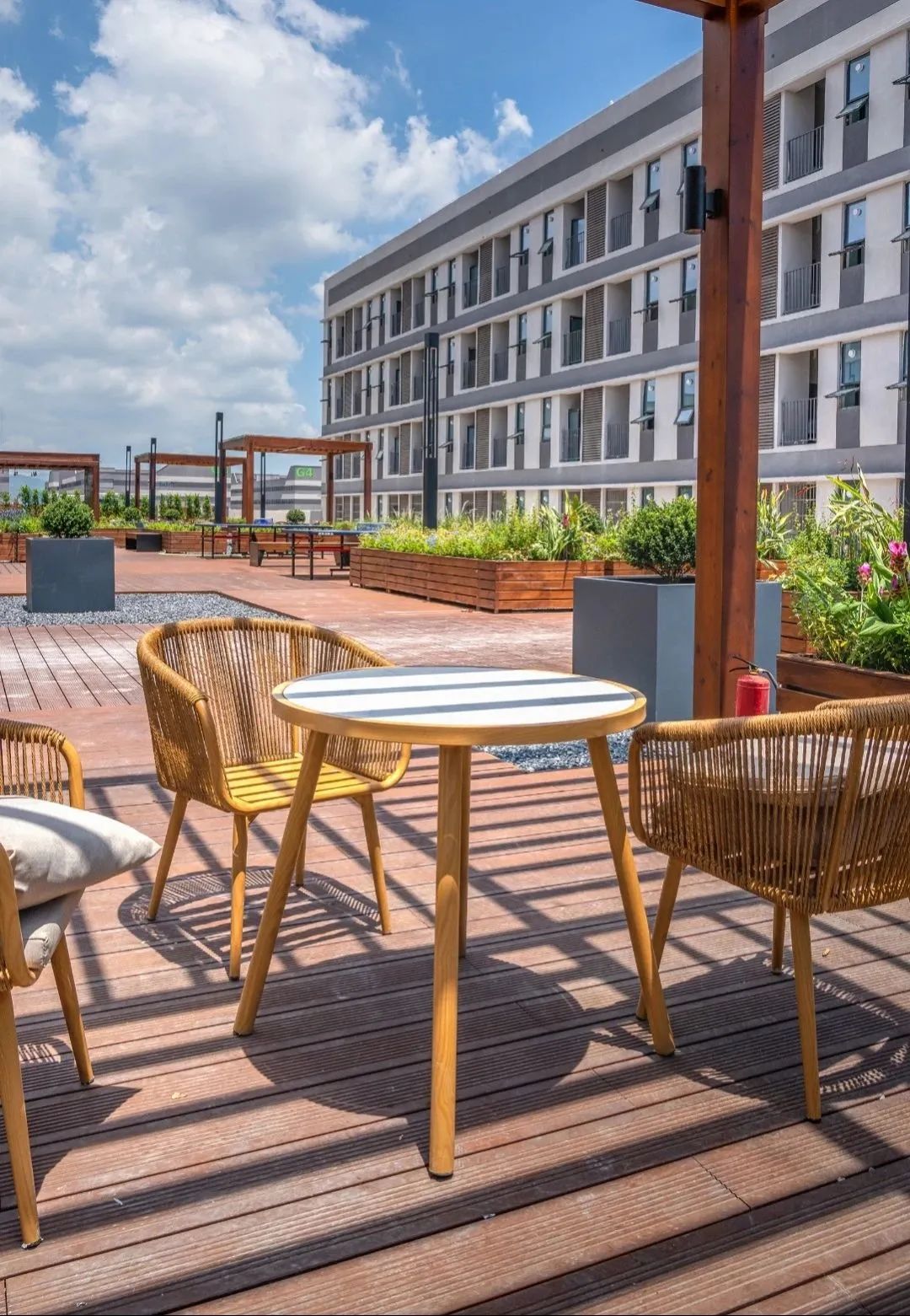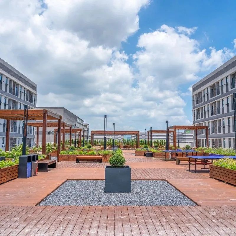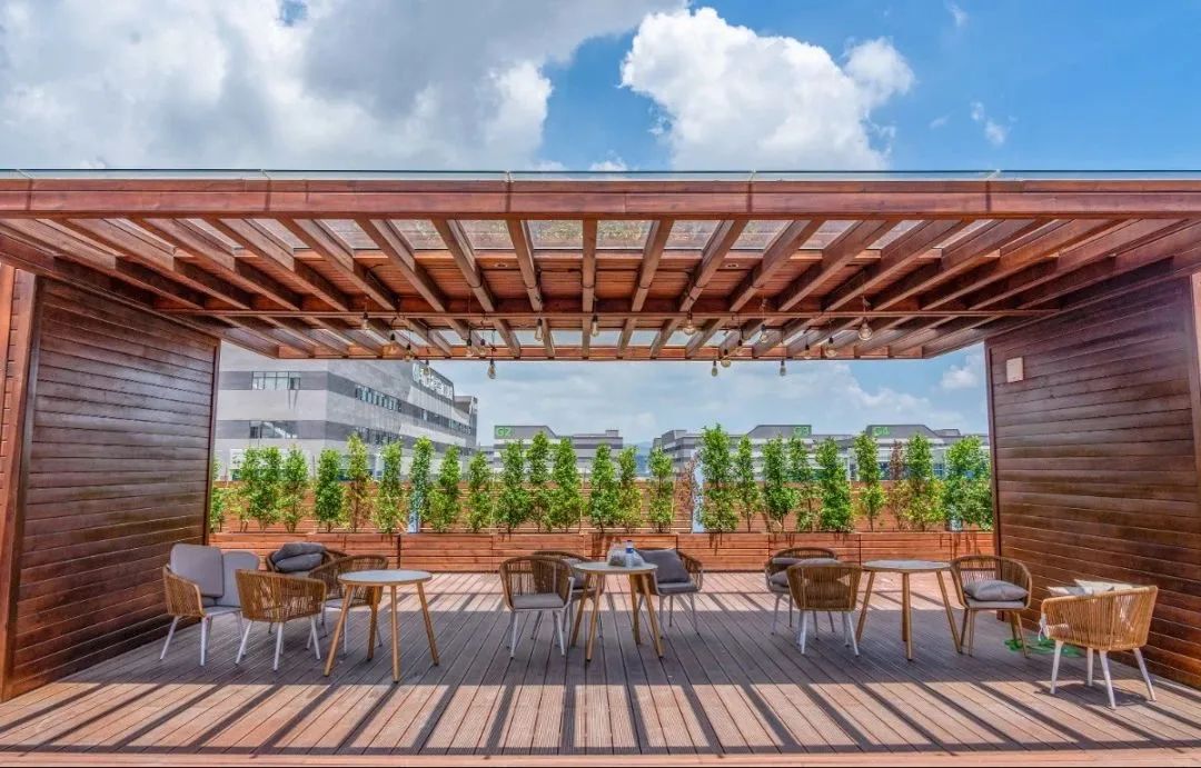 公共服務(wù)中心三層平臺設(shè)置了屋頂花園,形成半開放式創(chuàng)新社區(qū)。考慮到公共服務(wù)中心宿舍的分布,屋頂花園位于兩側(cè)宿舍動線中軸。