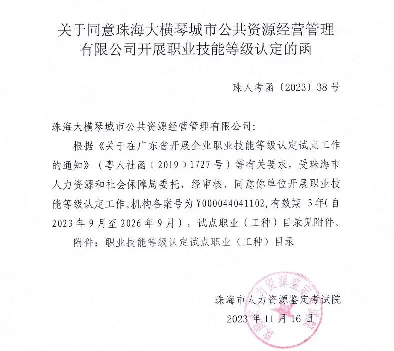 通過(guò)該項(xiàng)備案申請(qǐng)后,當(dāng)前,大橫琴城資可面向公司職工組織開(kāi)展職業(yè)技能等級(jí)認(rèn)定工作,包括評(píng)價(jià)規(guī)范的制定、評(píng)價(jià)的方式、指標(biāo)的設(shè)定、具體的實(shí)施、認(rèn)定公示和證書(shū)的核發(fā)等。