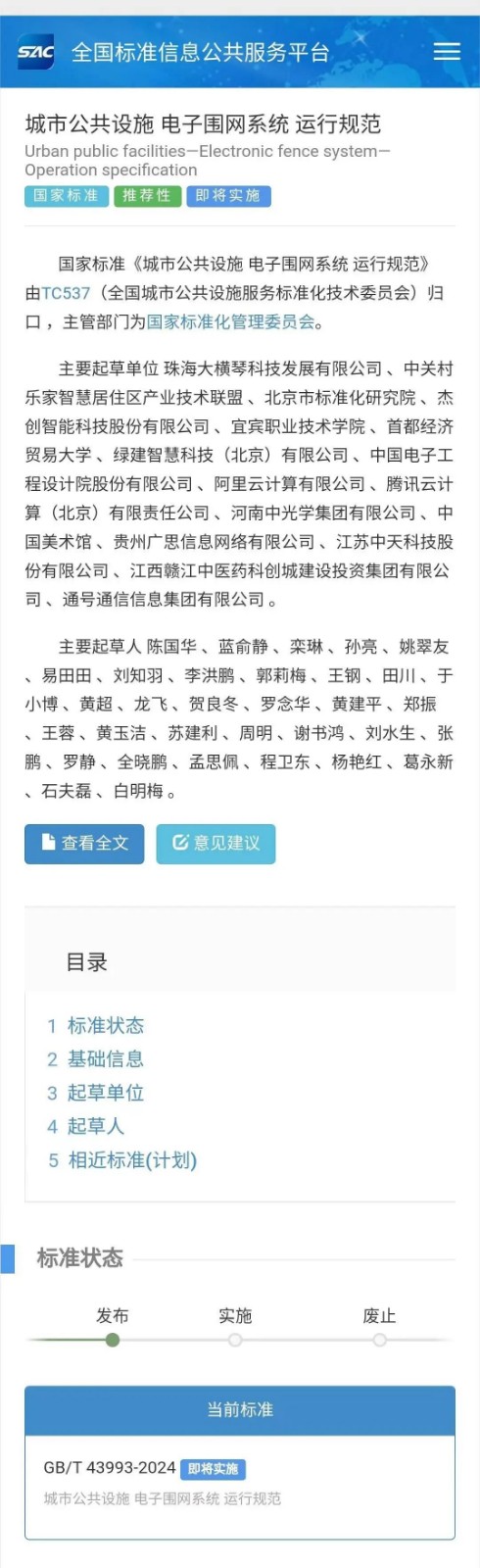 GB/T 43993-2024《城市公共設(shè)施 電子圍網(wǎng)系統(tǒng) 運(yùn)行規(guī)范》于2021年12月立項(xiàng),由大橫琴科技公司主導(dǎo)制定,TC537全國(guó)城市設(shè)施服務(wù)標(biāo)準(zhǔn)化技術(shù)委員會(huì)提供指導(dǎo)。標(biāo)準(zhǔn)制定工作組經(jīng)過(guò)深度場(chǎng)景調(diào)研、密集專題討論、廣泛征求意見(jiàn)、嚴(yán)格技術(shù)審查,歷經(jīng)兩年研制周期,最終確立了電子圍網(wǎng)系統(tǒng)運(yùn)行架構(gòu),明確了運(yùn)行總體原則,并對(duì)電子圍網(wǎng)系統(tǒng)的運(yùn)行資源、運(yùn)行服務(wù)、運(yùn)行評(píng)價(jià)改進(jìn)進(jìn)行了全面規(guī)范化。該標(biāo)準(zhǔn)于2024年4月25日正式發(fā)布,并于2024年11月1日起正式實(shí)施。