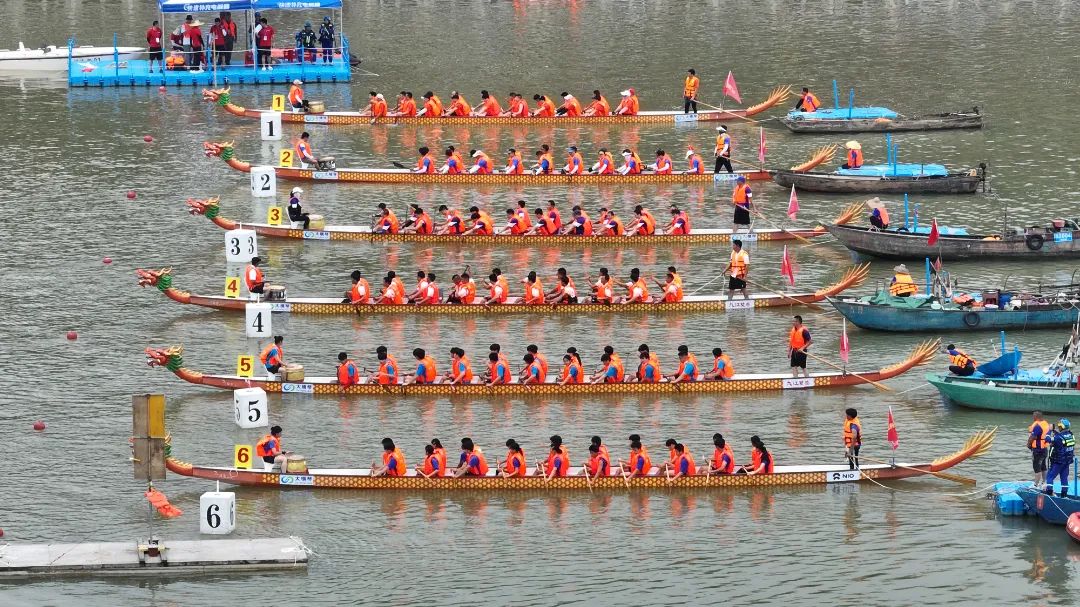 云旗獵獵,鑼鼓頻催。賽場上,在富有節(jié)奏的鼓聲下,整齊劃一的動作,奮力揮槳、劈波斬浪,河面上演著“速度與激情”。