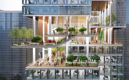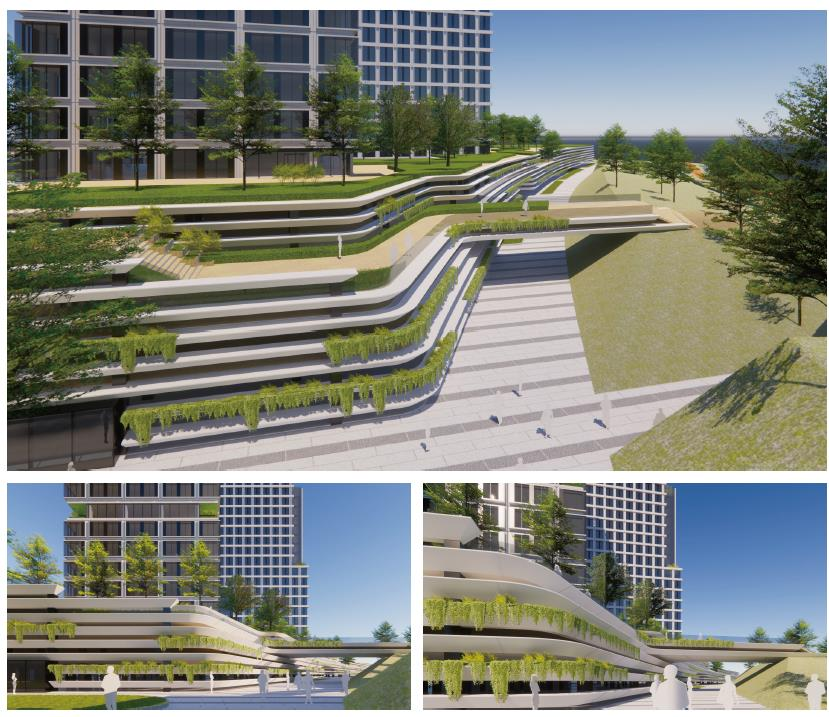 建筑組團(tuán)中央,通高兩層的“城市客廳”成為思想碰撞的熔爐;三層空中云臺(tái)通過有蓋廊道串聯(lián)樓宇,形成全天候的公共步行紐帶;而垂直分布的空中花園與地面綠脊,共同構(gòu)建出覆蓋率超30%的生態(tài)綠脈。