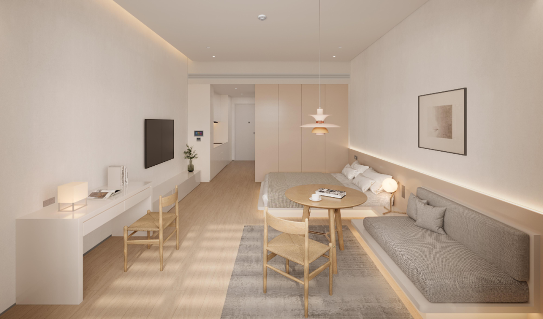 人文關(guān)懷時(shí)刻滲透生活場(chǎng)景。員工宿舍中,33-47平方米單間占比近90%,首層共享廚房飄散著家常煙火;專家公寓21%為一房以上戶型,引入酒店式保潔與健身服務(wù);四組分散式食堂與900平方米宴會(huì)廳通過地下廚房聯(lián)動(dòng),既能滿足日常餐飲,亦可瞬時(shí)承接千人國(guó)際會(huì)議。在這里,每一寸混凝土都承載著創(chuàng)新的重量,每一扇落地窗都映照著產(chǎn)業(yè)的未來?!@是珠光集團(tuán)對(duì)創(chuàng)新生態(tài)的溫暖承諾。